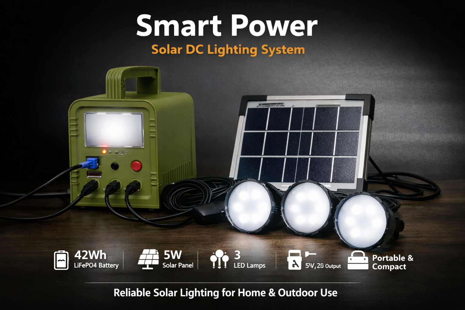 يأتي مع بطارية LiFePO4 بسعة 42Wh ولوح شمسي 5 واط و3 لمبات LED قوية مع إمكانية شحن الهواتف | Comes with a 42Wh LiFePO4 battery, 5W solar panel, 3 powerful LED lamps, and phone charging capability